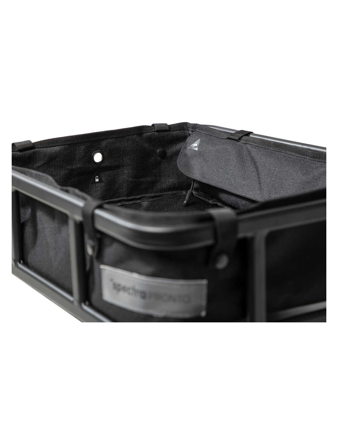 Spectra Pronto "Baker boy " är en låda bred nog att lasta en hel plåt med godsaker, ett flak med dricka eller det där stora paketet du just hämtat ut i kiosken. Ramen runt bottenplattan bygger upp 15 cm och har en insats i polyester material. En särskild ficka är insydd för småförvaring så som mobil och nycklar. Ett regnskydd infällt i lådans kant skyddar det du har med dig för vädrets makter. Under lådan sitter smarta AVS-klickfästen undertill som gör det snabbt och enkelt att klicka på en pakethållare förberedd för AVS eller med en s.k AVS-adapter. Lådan har reflekterande element för ökad trygghet och synlighet vid mörkercykling. Lådan är kompatibel med Spectras vajerlås för att förhindra att det du förvarar i lådan blir stulet.
